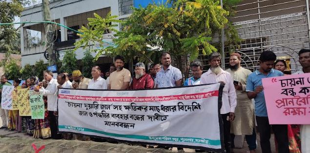 শ্যামনগরে চায়না দুয়ারি জাল নিষিদ্ধের দাবিতে মানববন্ধন