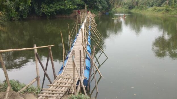কলারোয়ায় বাঁশের ভাসমান সাঁকোয় নদী পারাপার