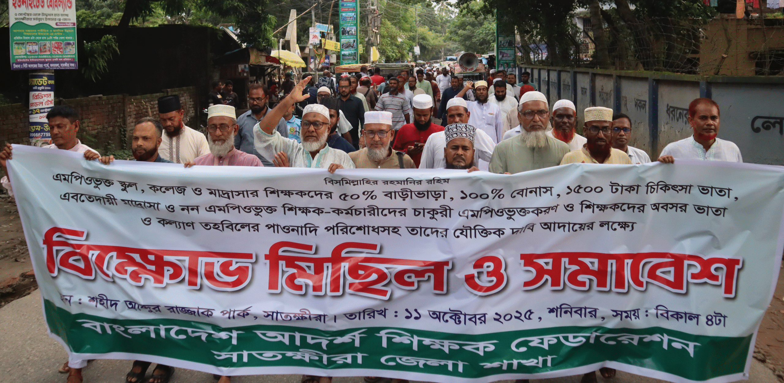 এমপিওভুক্ত শিক্ষা প্রতিষ্ঠানের শিক্ষক—কর্মচারীদের ৫০ শতাংশ বাড়ি ভাড়া, ১০০ শতাংশ উৎসব ভাতা, ১ হাজার ৫০০ টাকা চিকিৎসা ভাতা, ইবতেদায়ী মাদ্রাসা ও নন—এমপিও শিক্ষা প্রতিষ্ঠান এমপিওভুক্তকরণসহ অবসরপ্রাপ্ত শিক্ষকদের কল্যাণ তহবিল ও অবসর সুবিধার অর্থ দ্রুত পরিশোধের দাবিতে বিক্ষোভ মিছিল ও সমাবেশ করেছে বাংলাদেশ আদর্শ শিক্ষক ফেডারেশন (বাআশিফ) সাতক্ষীরা জেলা শাখা।