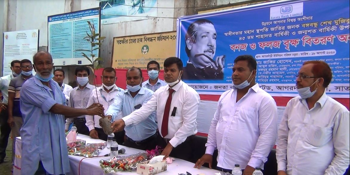 সাতক্ষীরায় স্বাধীনতার মহান স্থপতি জাতির জনক বঙ্গবন্ধু শেখ মুজিবুর রহমানের ৪৫তম শাহাদত বার্ষিকী ও মুজিব বর্ষ উপলক্ষে ফলজ ও বনজ বৃক্ষ বিতরণ করেছে জনতা ব্যাংক আগরদাড়ী শাখা।