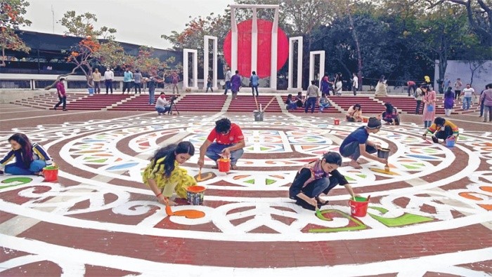 সরেজমিনে দেখা গেছে, কেন্দ্রীয় শহীদ মিনারের মূল বেদিতে আলপনার আঁকার কাজ শেষ হয়েছে।